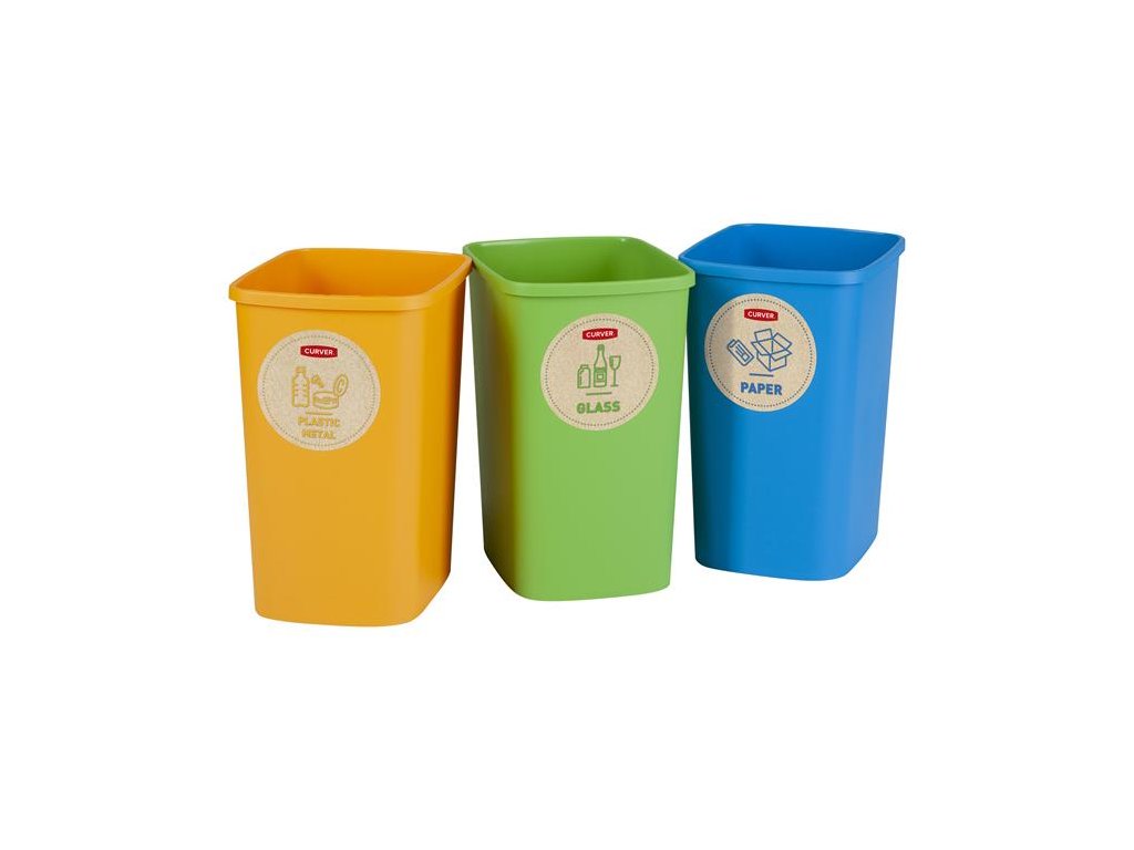 Sada na triedenie odpadkov Curver ECO Friendly 3x9 litrov je skvelým riešením na separáciu odpadu. Odpadkové koše sú vyrobené v špeciálnych farbách so špeciálnymi štítkami, ktoré umožňujú jednoduchú identifikáciu kategórie odpadu; žltá: kovy a plasty, modrá: papier a zelená: sklo. Vďaka svojmu minimalistickému dizajnu sa hodí do každého kuchynského interiéru a jeho elegantný tvar je ideálny do obmedzených priestorov.- Kapacita: 3x9 litrov
